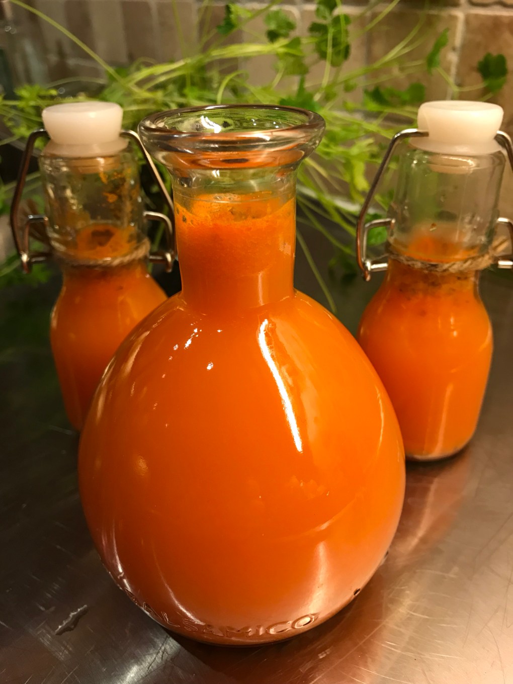 Skala citron, lime, morötter, ingefÀra och gurkmeja. Kör ingefÀra och gurkmeja först i juicecentrifugen sen tar du morötter, lime och citron och kör tills det inte kommer nÄgot mer. Ta bort kannan frÄn centrifugen. TillsÀtt honung, svartpeppar och vatten, rör tills allt blandats ut ordentligt.