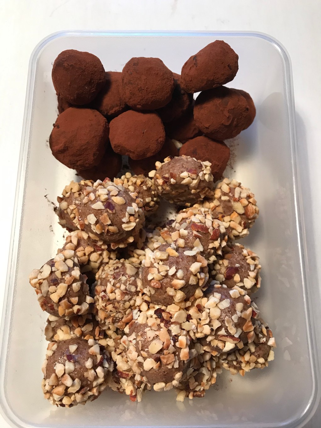 Tillsätt övriga ingredienser rör ihop allt. Rulla i de rostade hasselnötshacket eller kakao